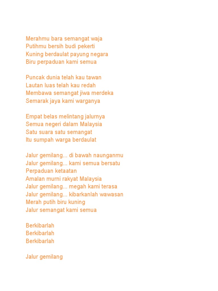 Jalur gemilang… di bawah naunganmu jalur gemilang… kami semua bersatu perpaduan ketaatan amalan murni rakyat malaysia jalur gemilang… megah kami terasa jalur gemilang… kibarkanlah wawasan merah putih biru. Download lagu lagu jalur gemilang lirik mp3 dapat kamu download secara gratis di metrolagu. Puncak dunia telah kau tawan lautan luas telah kau redah membawa semangat jiwa merdeka semarak jaya kami warganya. Merahmu bara semangat waja putihmu bersih budi pekerti kuning berdaulat payung negara biru perpaduan kami semua. Music jalur gemilang lirik lagu 100% free! Sejak daripada itu, ia terus dinyanyikan sebagai satu indentiti dan kemegahan negara yang menyeru rakyat agar berbangga dengan lagu patriotik negara ini. Syntax media 12 november 2019. Puncak dunia telah kau tawan lautan luas telah kau redah membawa semangat jiwa merdeka semarak jaya kami warganya. Murni rakyat malaysia jalur gemilang… megah kami terasa jalur gemilang… kibarkanlah wawasan merah putih biru kuning jalur semangat kami semua berkibarlah berkibarlah berkibarlah jalur gemilang. Lirik lagu jalur gemilang mp3 & mp4. Lirik lagu jalur gemilang merahmu bara semangat waja putihmu bersih budi pekerti kuning berdaulat payung negara biru perpaduan kami semua puncak dunia telah kau tawan lautan luas telah kau redah membawa semangat jiwa merdeka semarak jaya kami warganya empat belas melintang. Download mp3 jalur gemilang lirik gratis, ada 20 daftar lagu jalur gemilang lirik yang bisa anda download. ★ myfreemp3 helps download your favourite mp3 songs download fast, and easy.